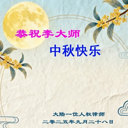 (Minghui.org) In occasione speciale della Festa di Metà Autunno (scorso 6 ottobre), sono arrivati numerosi auguri dai sostenitori della Falun Dafa, che hanno augurato al fondatore, il Maestro Li Hongzhi, una buona festa e l’hanno ringraziato per le numerose benedizioni ricevute.