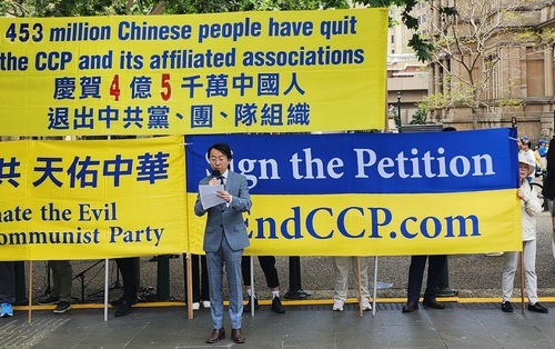 (Minghui.org) Lo scorso 28 settembre, i praticanti della Falun Dafa hanno organizzato un raduno davanti al municipio di Sydney per celebrare i 450 milioni di cinesi che hanno abbandonato il Partito Comunista Cinese (PCC) e le sue organizzazioni giovanili affiliate. Gli ospiti intervenuti hanno elogiato l'ondata di dimissioni dal PCC, definendo coloro che hanno avuto il coraggio di lasciare le sue organizzazioni come i pionieri di una futura Cina libera.