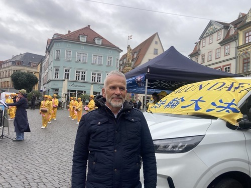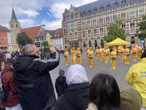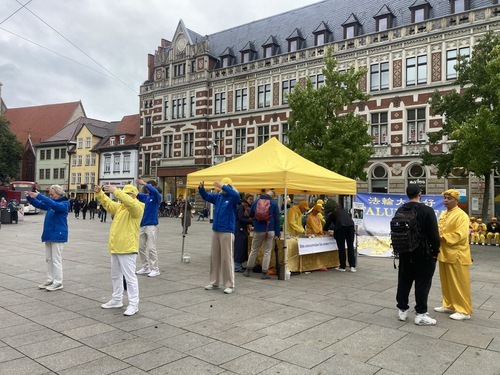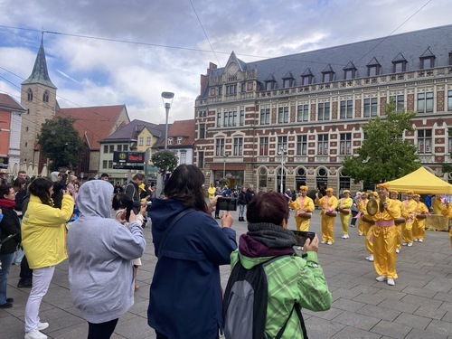 Erfurt è la capitale dello stato tedesco della Turingia, i praticanti della Falun Dafa hanno allestito degli stand al Fischmarkt e all'Anger Platz, dove hanno dimostrato gli esercizi, suonato i tamburini e tenuto discorsi.