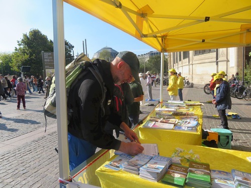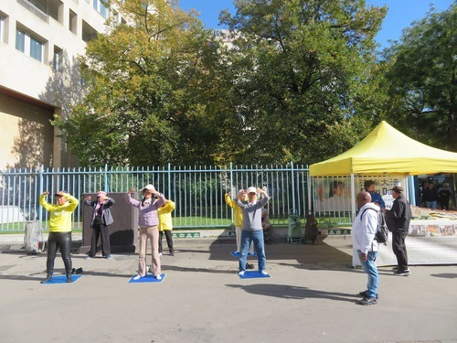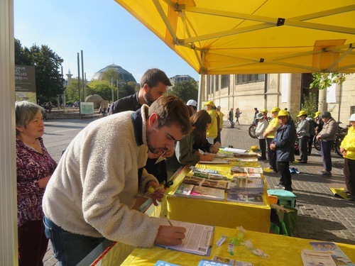 L’11 ottobre hanno dimostrato gli esercizi durante l'evento a Châtelet, e molte persone si sono fermate ad assistere. In tanti volevano conoscere meglio la Falun Dafa e annotare il luogo di pratica di Parigi. Gli striscioni e i pannelli espositivi dei praticanti hanno attirato l'attenzione del pubblico. Dopo aver appreso la verità sulla Falun Dafa e sul prelievo forzato di organi da parte del PCC ai danni dei prigionieri di coscienza (la maggior parte dei quali sono praticanti della Falun Dafa), la gente ha espresso la propria indignazione e ha firmato una petizione per chiedere la fine della persecuzione.