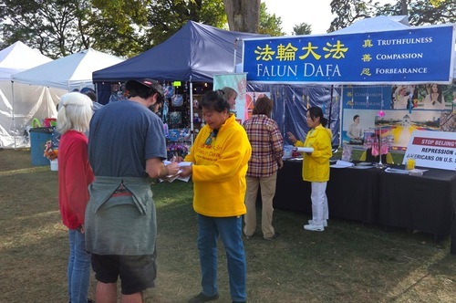 I praticanti hanno allestito uno stand dove hanno dimostrato gli esercizi della Falun Dafa e parlato alla gente della persecuzione della pratica (chiamata anche Falun Gong) da parte del Partito Comunista Cinese (PCC). Molte persone hanno firmato una petizione a sostegno della Legge sulla protezione del Falun Gong e una donna ha affermato di sperare che gli Stati Uniti non vengano sfruttati dal PCC.