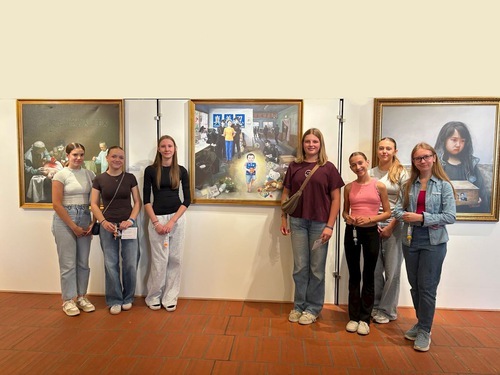 Diversi studenti delle scuole di Donauwörth hanno visitato la mostra, si sono diretti subito verso il dipinto “Preserving the Treasure” (Preservare il tesoro), e si sono fatti fotografare.