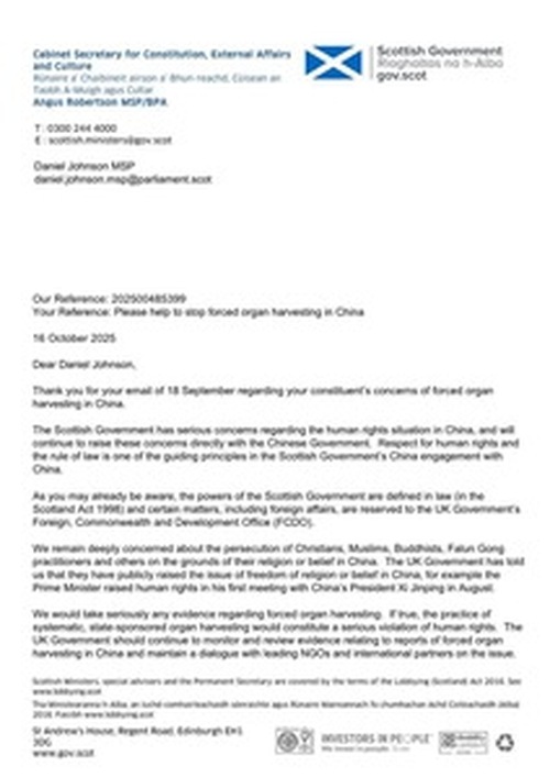 Il 16 ottobre, Angus Robertson, Segretario di Gabinetto per la Costituzione, per gli Affari Esteri e per la Cultura della Scozia, ha scritto a Daniel Johnson, membro del Parlamento scozzese (MSP), dichiarando: “Il governo scozzese nutre serie preoccupazioni riguardo alla situazione dei diritti umani in Cina e continuerà a sollevare tali preoccupazioni direttamente con il governo cinese. Il rispetto dei diritti umani e dello Stato di diritto è uno dei principi guida dell'impegno del governo scozzese nei confronti della Cina”.