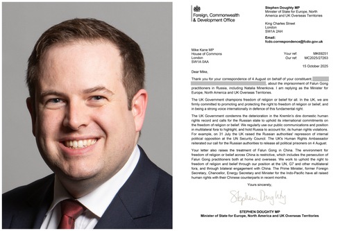 Per quanto riguarda la persecuzione del Falun Gong da parte della Russia sotto l'influenza del PCC, ha dichiarato: “Il governo britannico condanna il peggioramento della già grave situazione dei diritti umani in Russia e invita lo Stato russo a rispettare i propri impegni internazionali in materia di libertà di religione o di credo. Utilizziamo regolarmente le nostre comunicazioni pubbliche e la nostra posizione nei forum multilaterali per evidenziare le violazioni dei diritti umani da parte della Russia e per chiederne conto”. Ad esempio, il 31 luglio, il Regno Unito ha sollevato la questione della repressione dell'opposizione politica interna da parte delle autorità russe presso il Consiglio di sicurezza delle Nazioni Unite. Il 4 agosto, l'ambasciatore britannico per i diritti umani ha ribadito la nostra richiesta alle autorità russe di rilasciare tutti i prigionieri politici”.