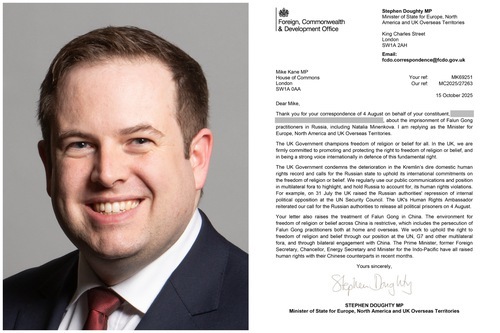 Stephen Doughty, membro del Parlamento e Ministro di Stato per l'Europa, il Nord America e i territori d'oltremare del Regno Unito, e la sua lettera