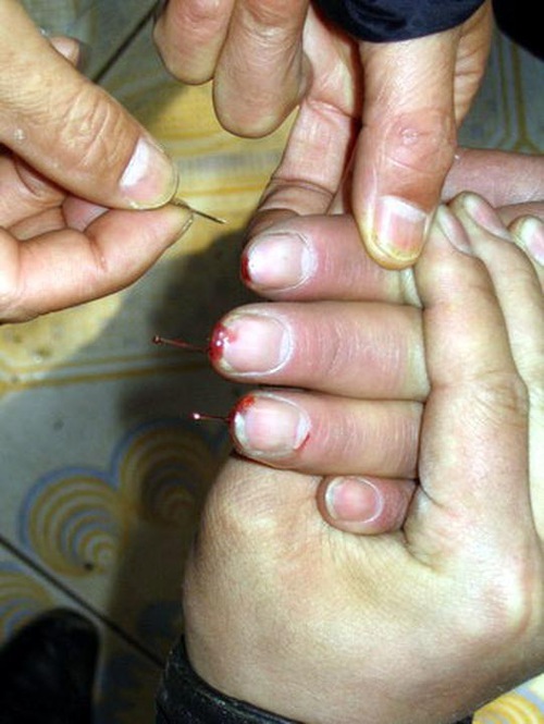 Rievocazione della tortura: pungere la punta delle dita con degli aghi