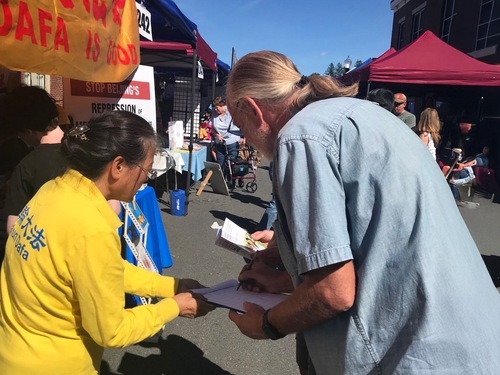Un imprenditore di successo di 58 anni si è fermato allo stand della Falun Dafa, e ha sfogliato diverse riviste sulla pratica, affermando di essere pienamente d'accordo con i principi della pratica.