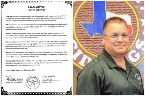 Il 22 settembre, il sindaco Joel Lopez di Giddings ha emesso un proclama per Shen Yun Performing Arts, elogiando per aver messo in mostra l'essenza della cultura divinamente ispirata con spettacoli squisiti, a beneficio della comunità e del Paese, e ha inoltre elogiato gli artisti di Shen Yun per il loro coraggio e gentilezza di fronte alla repressione transnazionale del Partito Comunista Cinese (PCC).