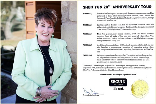 “Pertanto, io, Donna Dodgen, sindaco della città di Seguin, con la presente proclamo l’odierno martedì 30 settembre come giornata di celebrazione e riconoscimento del 20° anniversario del tour Shen Yun Performing Arts nella città di Seguin, Texas.”