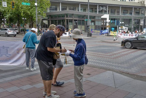 (Minghui.org) I praticanti della Falun Dafa organizzano regolarmente attività nel centro di Seattle per denunciare la persecuzione del Partito Comunista Cinese (PCC), esponendo striscioni, distribuendo volantini e raccogliendo firme su petizioni, che molti sostengono. Nel corso degli anni, la loro perseveranza e compassione hanno conquistato il rispetto e il supporto del pubblico.
