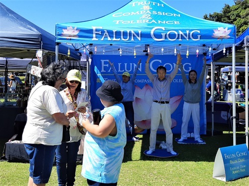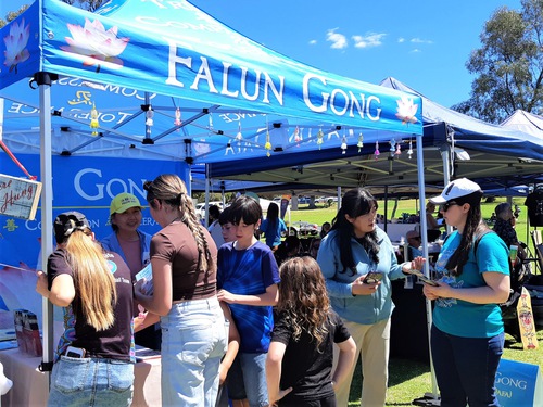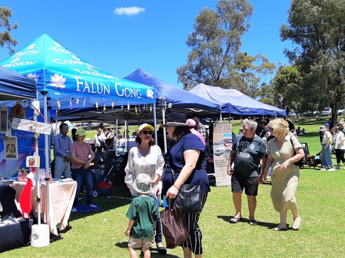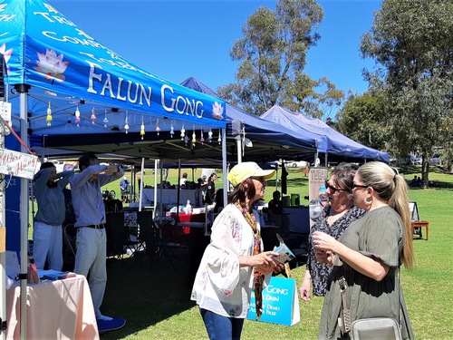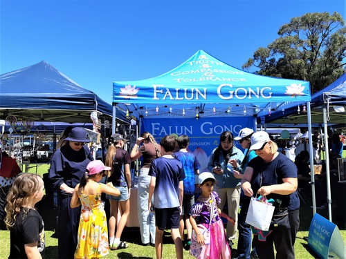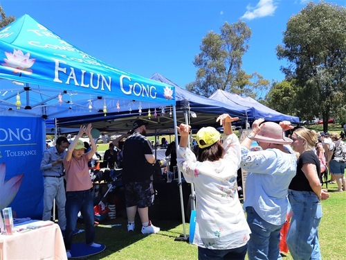 (Minghui.org) Lo scorso 8 novembre, l’annuale fiera della comunità Rotary Kwinana si è tenuta a Calista, a sud di Perth, con oltre 100 stand. Anche i praticanti della Falun Dafa ne hanno allestito uno che ha attirato molti visitatori, e alcune persone hanno espresso il desiderio di imparare subito gli esercizi durante l’evento.