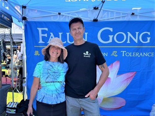 Kris (a sinistra) e Gary (a destra) sostengono la Falun Dafa
