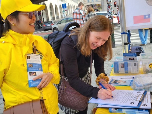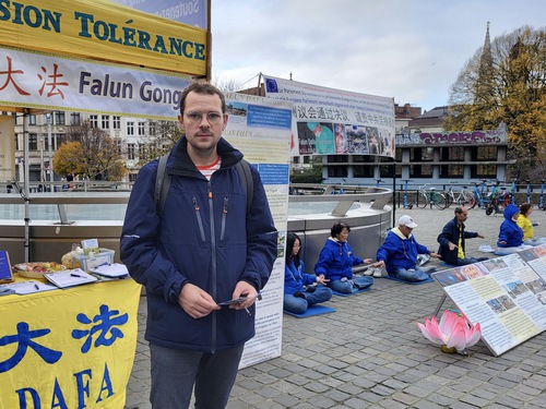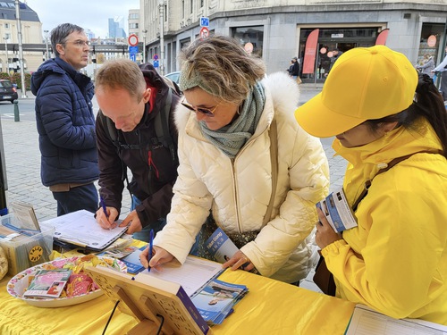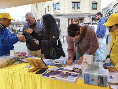 Marine, che lavora presso l'Associazione Francese per la Cultura e gli Scambi Internazionali, ha parlato a lungo con un praticante. Lei e l’amica erano in visita in Belgio quel fine settimana, ed era la prima volta che entrambe sentivano parlare della persecuzione. Dopo aver letto il cartellone informativo, Marine ha pensato di dover fare qualcosa, come firmare la petizione, sostenendo che era importante far conoscere la persecuzione a più persone. “Vorrei saperne di più per via del mio lavoro”, ha detto.