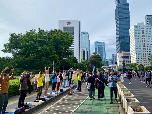 I praticanti hanno eseguito esercizi di gruppo durante la Giornata senza auto a Giacarta