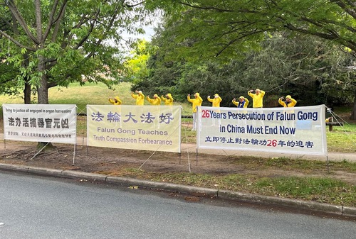 Durante l'ora di punta mattutina, per diversi giorni consecutivi, i praticanti hanno esposto striscioni, dimostrato le cinque serie di esercizi e raccolto firme nel centro di Canberra per fermare il prelievo di organi