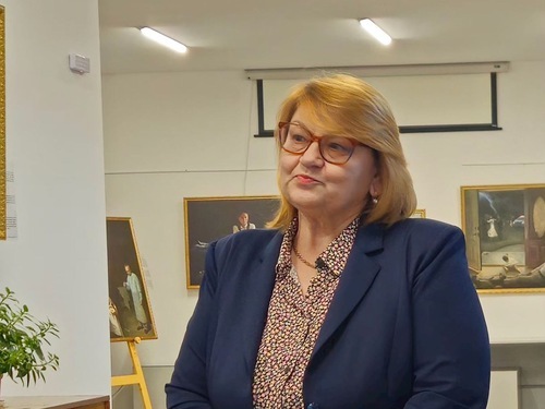 La giornalista Klara Metodieva mentre osserva un dipinto