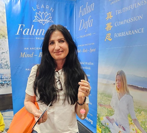 Ha affermato che i principi di Verità, Compassione e Tolleranza le risuonano dentro. “Penso che quello che state facendo sia meraviglioso. Continuate a diffondere la bellezza della Falun Dafa, la sensazione di pace e i principi nella vita quotidiana”.