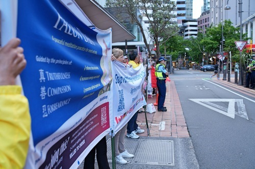 I praticanti hanno distribuito volantini ai passanti e ai giornalisti, invitando il governo neozelandese a prestare attenzione alla persecuzione del PCC, ed esortandolo a negare l'ingresso e a sanzionare i funzionari del PCC coinvolti nella persecuzione, attraverso una legislazione in linea con il Magnitsky Act, e chiedendo alla Nuova Zelanda di pronunciarsi contro la persecuzione.