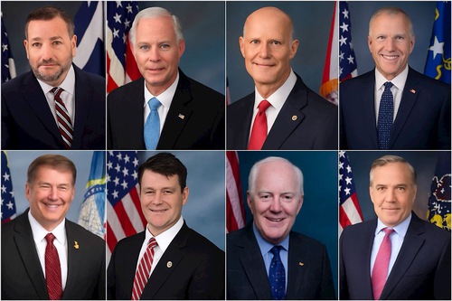 Senatori promotori della Legge sulla protezione del Falu Gong(S.817) (da sinistra a destra e dall'alto verso il basso): promotore, il senatore repubblicano del Texas Ted Cruz; co-promotori: Senatori Ron Johnson (Wisconsin), Rick Scott (Florida), Thom Tillis (North Carolina), Mike Rounds (South Dakota), Todd Young (Indiana), John Cornyn (Texas) e David McCormick (Pennsylvania).