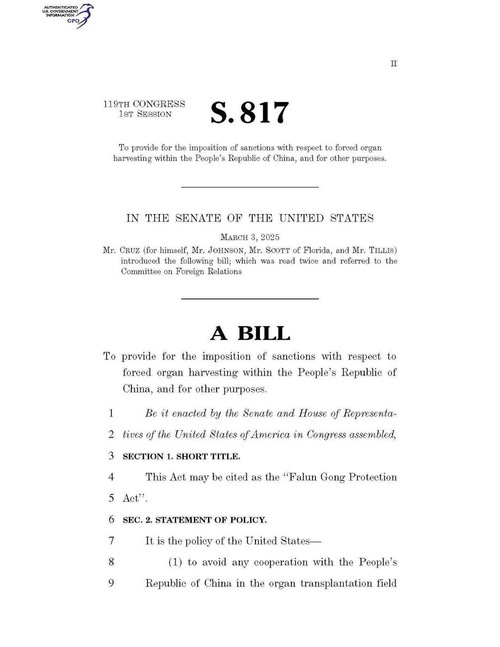 La Legge sulla protezione del Falun Gong (S.817) è stata presentata dal senatore Ted Cruz il 3 marzo scorso, e il disegno di legge afferma che il Partito Comunista Cinese (PCC) continua a praticare il prelievo forzato di organi dai praticanti del Falun Gong, e prevede sanzioni per coloro che ne sono coinvolti.
