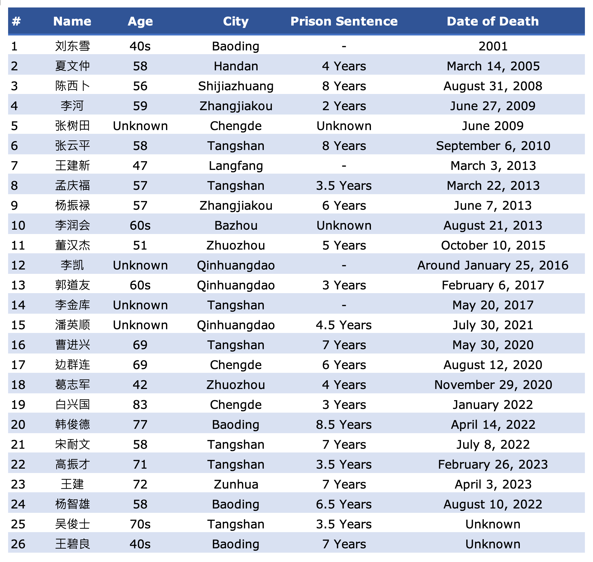 Il signor Lai Zhiqiang, sulla cinquantina, era un autista di autobus della città di Tangshan. Il 31 marzo 2016 è stato arrestato e condannato in segreto a sette anni di reclusione; l'uomo è stato rinchiuso nella Prigione di Jidong. Sua moglie ha atteso sette lunghi anni, desiderosa di ricongiungersi con lui, solo per scoprire, il 3 gennaio 2023, che era deceduto due mesi prima della sua prevista scarcerazione.