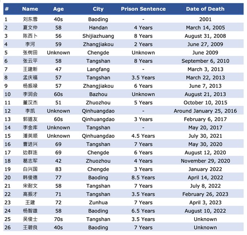 I praticanti maschi del Falun Gong, condannati a più di tre mesi dai vari tribunali della provincia dell'Hebei, vengono inviati alla Prigione di Jidong e detenuti nella prima, seconda, quarta o quinta divisione.