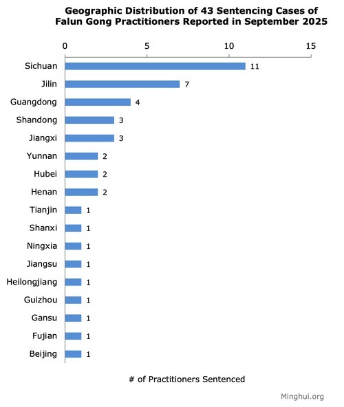 I praticanti del Falun Gong condannati provenivano da 17 province o municipalità controllate dal governo centrale. Il Sichuan ha segnalato il maggior numero di casi (11), seguito dallo Jilin (sette) e il Guangdong (quattro). Lo Jiangxi e lo Shandong hanno registrato tre casi ciascuno. Le restanti 12 regioni hanno registrato uno o due casi ciascuna.