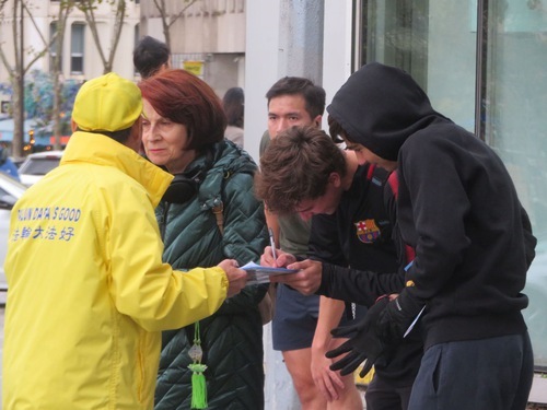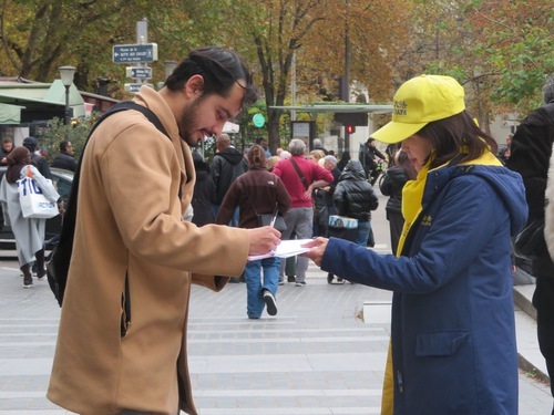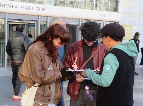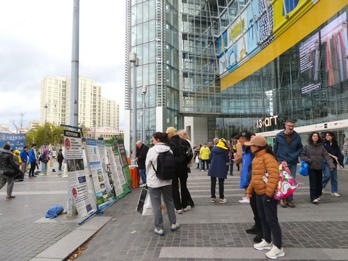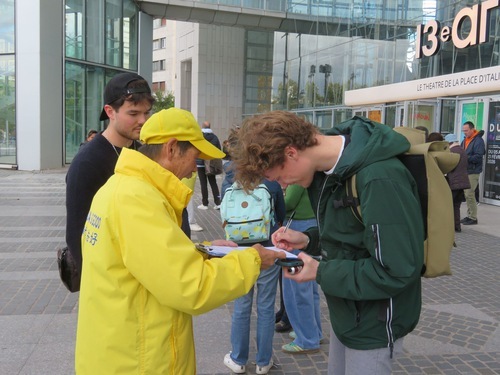 Situata nella XIII circoscrizione di Parigi, Piazza d’Italia si trova in un grande centro commerciale, con il palazzo del governo della circoscrizione situato dall'altro lato della piazza. Sabato 25 ottobre, i praticanti hanno allestito uno stand di fronte al centro commerciale, le persone che li osservavano dimostrare i cinque esercizi del Falun Gong, hanno appreso che il Partito Comunista Cinese (PCC) perseguita coloro che seguono i principi di Verità, Compassione e Tolleranza in Cina. Sono stati anche informati del prelievo forzato di organi dai prigionieri di coscienza perpetrato dal PCC e sancito dallo Stato. Sbalorditi e indignati per le atrocità, molti hanno firmato la petizione che chiede la fine della persecuzione.