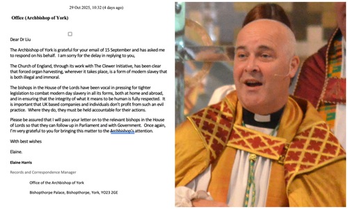 (Minghui.org) Il 29 ottobre Elaine Harris, dell'ufficio dell'arcivescovo di York Stephen Cottrell, ha inviato una lettera a suo nome all'Associazione Falun Dafa del Regno Unito. Nella lettera c’era scritto: “L'arcivescovo di York è grato per la vostra e-mail del 15 settembre e mi ha chiesto di rispondere a suo nome”.