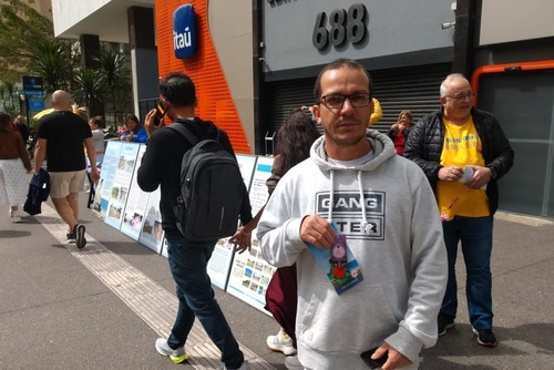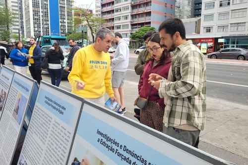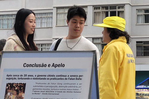 Due giovani immigrati in Brasile sono rimasti sconvolti nel vedere la persecuzione dei praticanti della Falun Dafa in Cina raffigurata sui pannelli, hanno imparato cos'è la Falun Dafa, e affermato che praticare secondo i principi di Verità, Compassione e Tolleranza è eccellente, quindi non riuscivano a capire perché il PCC volesse perseguitare una pratica così pacifica.