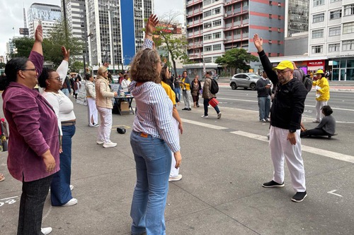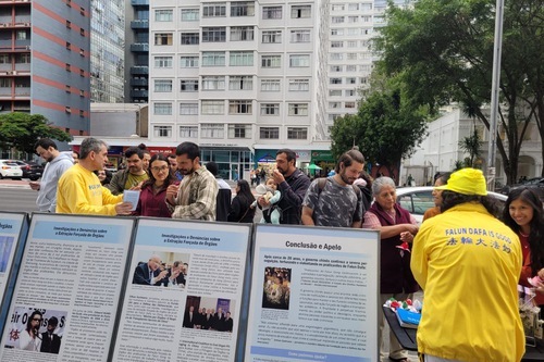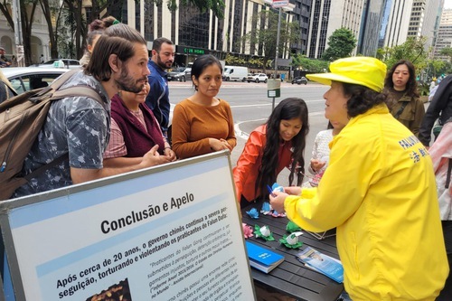 (Minghui.org) Lo scorso 9 novembre, i praticanti della Falun Dafa provenienti da diverse parti del Brasile, tra cui Rio de Janeiro, Brasil e Minas Gerais, si sono riuniti in Avenida Paulista, nel centro di San Paolo, per illustrare i benefici della loro pratica spirituale, e per informare residenti e turisti della persecuzione in corso da parte del Partito Comunista Cinese (PCC) nei confronti dei praticanti della Falun Dafa in Cina.