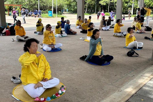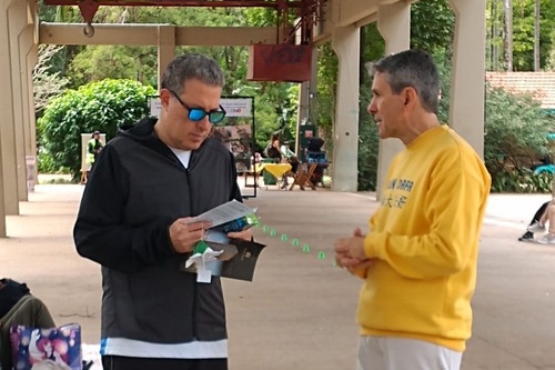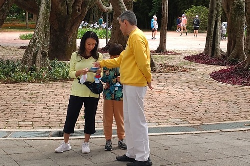 Quella mattina, i praticanti hanno eseguito gli esercizi, e letto gli insegnamenti della Falun Dafa al Parco Ibirapuera, un luogo popolare di San Paolo.