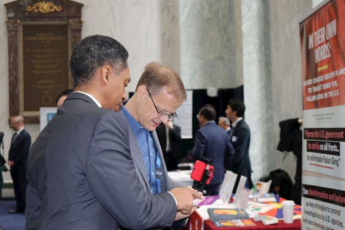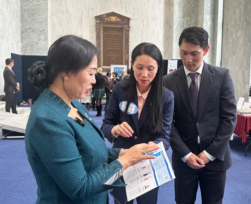 Wang Xuan, ex primo ballerino della Shen Yun Performing Arts, e la sorella Lydia Wang hanno incontrato il deputato Young Kim e altri visitatori, descrivendo le sofferenze dei loro genitori a causa della persecuzione del PCC. Il padre è stato imprigionato quattro volte per la fede in Verità, Compassione e Tolleranza, ed è deceduto nel settembre 2009. La madre, Liu Aihua, è attualmente imprigionata in Cina per la sua fede.