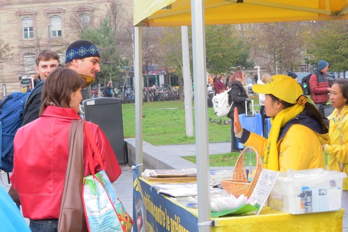 Una studentessa ha chiesto ai praticanti maggiori informazioni sulla persecuzione, e ha preso dei volantini da distribuire ai compagni di scuola, poi ha ringraziato i praticanti per averle fornito queste informazioni poco conosciute ma preziose.