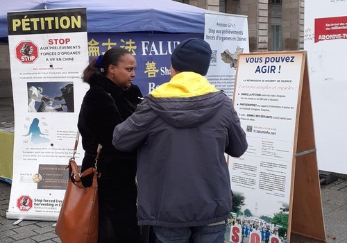 Nonostante la pioggia leggera, quel sabato prima delle vacanze invernali c'era comunque una grande folla in Place de la République, i praticanti hanno mostrato gli esercizi del Falun Gong e hanno condiviso informazioni con i passanti. La dimostrazione degli esercizi ha attirato molte persone che si sono fermate a scattare foto, alcuni hanno anche fotografato i cartelloni informativi. Molti si sono detti commossi nell'apprendere della persecuzione, e hanno firmato la petizione contro il prelievo forzato di organi, ringraziando i praticanti per essere lì.
