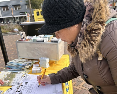 Una praticante l'ha ringraziata, rispondendole che non c'era bisogno di firmarla di nuovo, ma la donna ha insistito per firmarla a nome della figlia, e ha esclamato: "Questo crimine [il prelievo forzato di organi] deve essere fermato, è veramente malvagio!"
