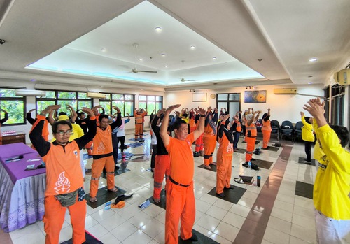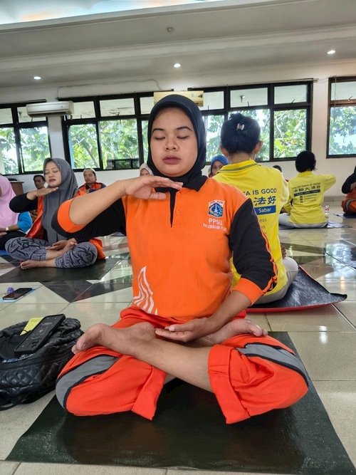 I dipendenti dell'unità di gestione delle infrastrutture e delle strutture pubbliche dell'ufficio del sottodistretto di Pluit, a Giacarta Nord, hanno imparato gli esercizi della Falun Dafa