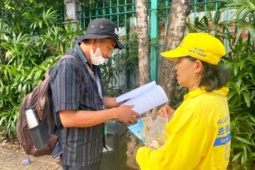 Il praticante gli ha spiegato che quello non era un luogo di pratica, ma che stavano tenendo una manifestazione pacifica per opporsi alla persecuzione del Falun Gong in Cina, indicando l'ufficio del consolato dall'altra parte della strada, e poi gli ha indicato dove si trovavano i luoghi di pratica locali, in modo che potesse continuare ad imparare gli esercizi.