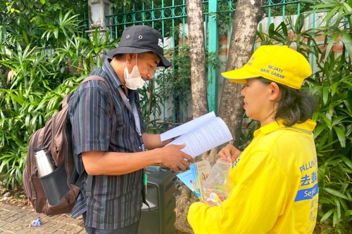 I passanti e gli agenti di polizia hanno ricevuto materiale informativo sul Falun Gong e sulla persecuzione del PCC in Cina