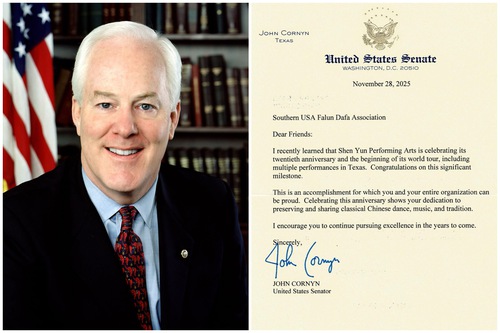 Il senatore statunitense John Cornyn del Texas ha scritto: “Ho recentemente appreso che Shen Yun Performing Arts sta celebrando il suo ventesimo anniversario e l'inizio del suo tour mondiale. Sono incluse diverse esibizioni in Texas. Congratulazioni per questo importante traguardo.”