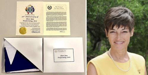 La senatrice dello Stato del Texas Donna Campbell, M.D., ha scritto nel certificato con cui ha donato la bandiera a Shen Yun: