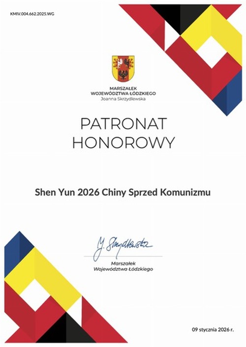 Il governatore di Łódź e i sindaci di Łódź e Toruń hanno concesso a Shen Yun il “Patronat Honorowy” (“Patrocinio Onorario”), un'alta onorificenza in Polonia riservata ad eventi culturali di eccezionale valore artistico e prestigio.