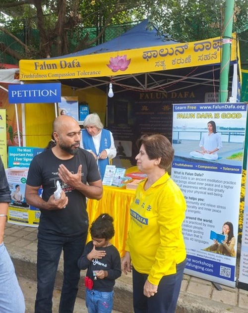 Nel frattempo, Santhosh, anche lui presente allo stand, ha riconosciuto l'importanza del lavoro dei praticanti: "State svolgendo un servizio straordinario", esprimendo ammirazione per gli elevati standard morali a cui i praticanti si attengono.