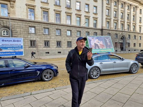 Danior, un uzbeko che lavora in Bulgaria, ha scattato un selfie davanti alle auto con i messaggi, e ha esclamato: "Qui in Bulgaria c'è libertà di parola, si può dire ciò che si pensa e farlo davanti alla Presidenza. Bravi per aver difeso i diritti umani di queste persone [i praticanti del Falun Gong in Cina]!".