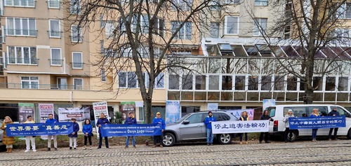 I praticanti hanno esposto striscioni con messaggi che chiedevano la fine del prelievo forzato di organi dai praticanti del Falun Gong in Cina, e alcuni praticanti hanno fatto gli esercizi della Falun Dafa, mentre altri hanno parlato con i passanti davanti all'ambasciata cinese.
