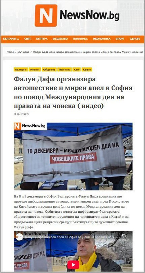 (Minghui.org) Nella settimana dello scorso 10 dicembre, Giornata internazionale dei diritti umani, l'Associazione bulgara della Falun Dafa (BFDA) ha organizzato a Sofia una serie di eventi per informare la popolazione sulla persecuzione in corso in Cina da parte del Partito Comunista Cinese (PCC), e il media online NewsNow.bg ha riportato la notizia degli eventi.