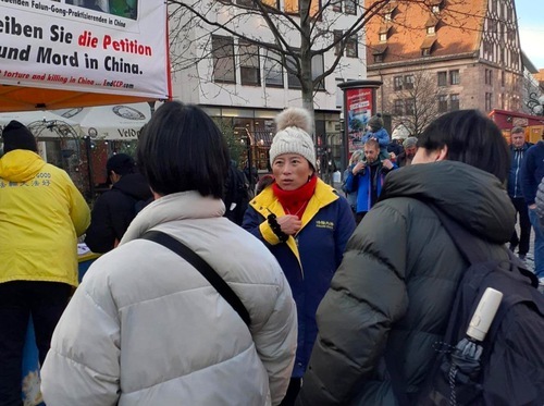 (Minghui.org) Lo scorso 20 dicembre i praticanti di Norimberga hanno tenuto una veglia al mercatino di Natale nel centro della città, hanno presentato la Falun Dafa (nota anche come Falun Gong), e sensibilizzato l'opinione pubblica sulla persecuzione del Partito Comunista Cinese (PCC).