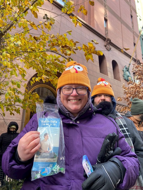 Ha spiegato che il Giorno del Ringraziamento è una festa che la porta a riflettere, e ad apprezzare ancora di più la Falun Dafa. I genitori e i figli hanno tutti tratto beneficio dalla pratica della Dafa. "Sono davvero grata di poter praticare la coltivazione", ha dichiarato. "Spero che le persone possano percepire l'energia positiva e il calore della Falun Dafa durante questa fredda festa".