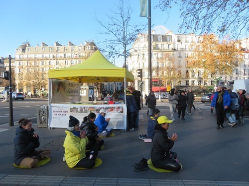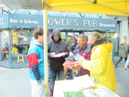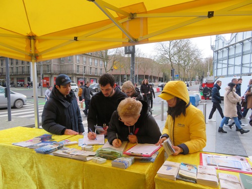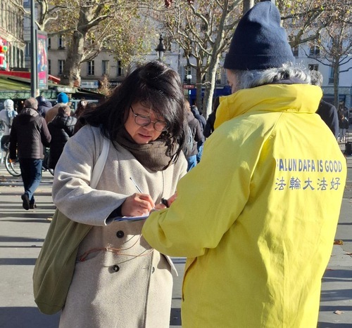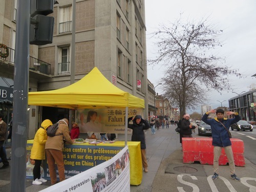Nonostante la pioggia del 29 novembre, molte persone si sono fermate a parlare con i praticanti nella Piazza Alphonse Fiquet, e hanno firmato la petizione che chiede la fine della persecuzione del PCC.