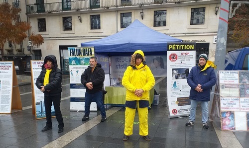 I praticanti hanno allestito uno stand nella Piazza de l'écluse di Nantes il 29 novembre, nonostante il maltempo, molte persone si sono fermate a parlare con i praticanti e hanno firmato la petizione che chiede la fine della persecuzione del PCC.